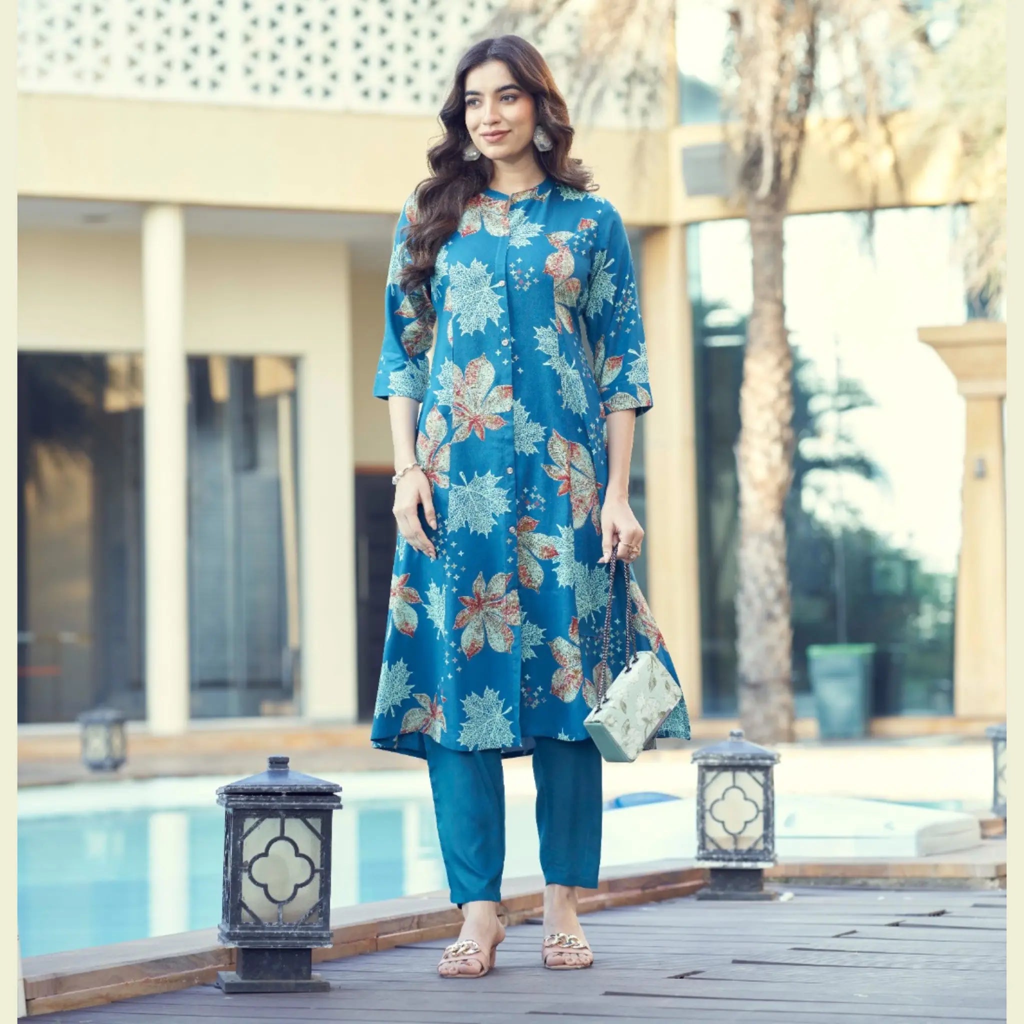 Chic Women’s Rayon A-Line Kurti with Foil Detailing & Knot Style Pants - Zheel 126
